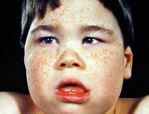 - špecifické črty tváre: telekantus – oči ďaleko od seba, krátky nos, plochá tvár, mikrocefália (malý obvod hlavičky)