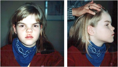 - mikrocefália, vysoké a úzke čelo, široký nosový mostík, epikantické ryhy, vysoké klenuté podnebie, krátky krk a nízko nasadené uši neobvyklého tvaru