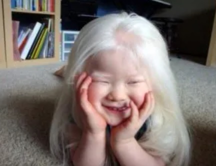 - postihnutý má bledú pleť, svetlé vlasy a modré oči, čo odráža nedostatok pigmentu melanínu, respektíve jeho prekurzora tyrozínu
