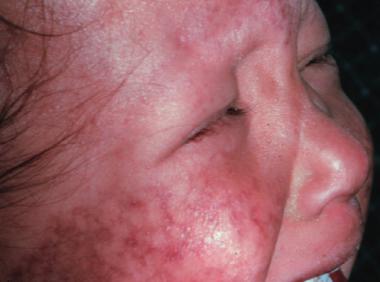 Príznaky tohto ochorenia sa rozvíjajú postupne. Najprv pozorujeme vyrážku na tvári, ktoré sa postupne presúva aj na ruky, nohy a zadok. Dochádza k postupnému stenčovaniu kože.